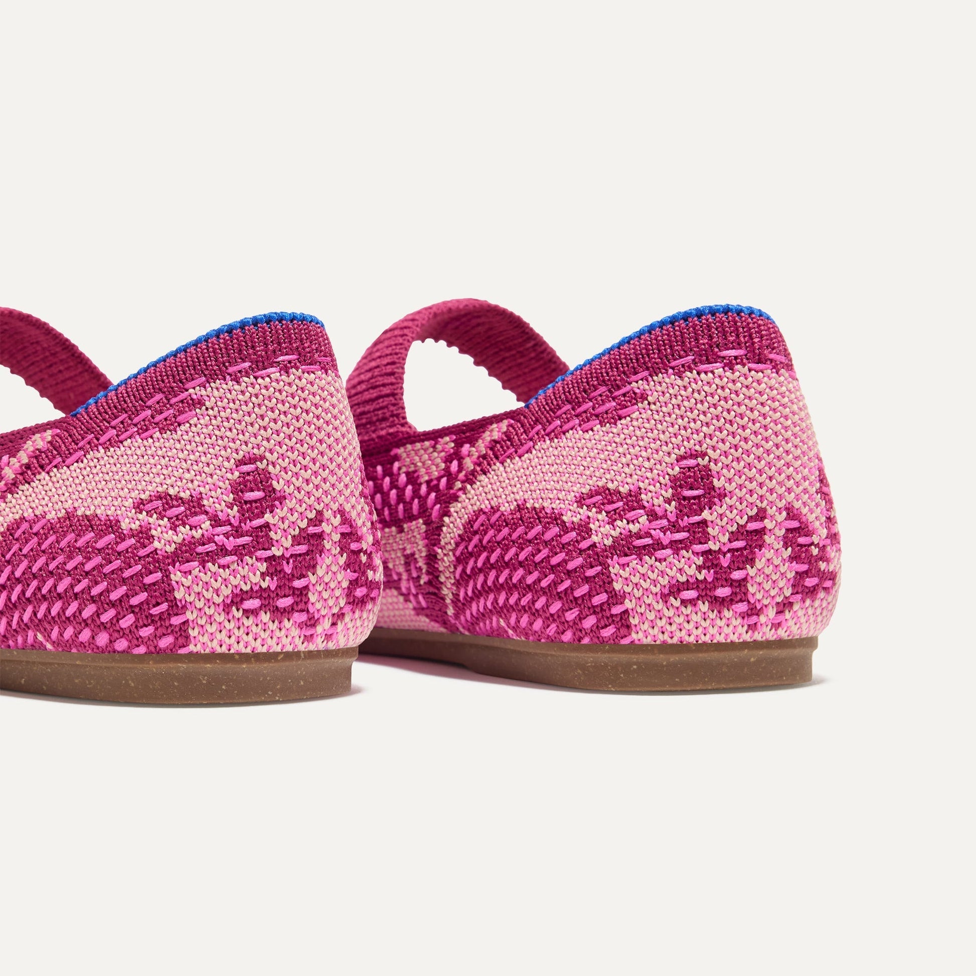 - Soft, flexible upper in blush pink with a magenta floral pattern.