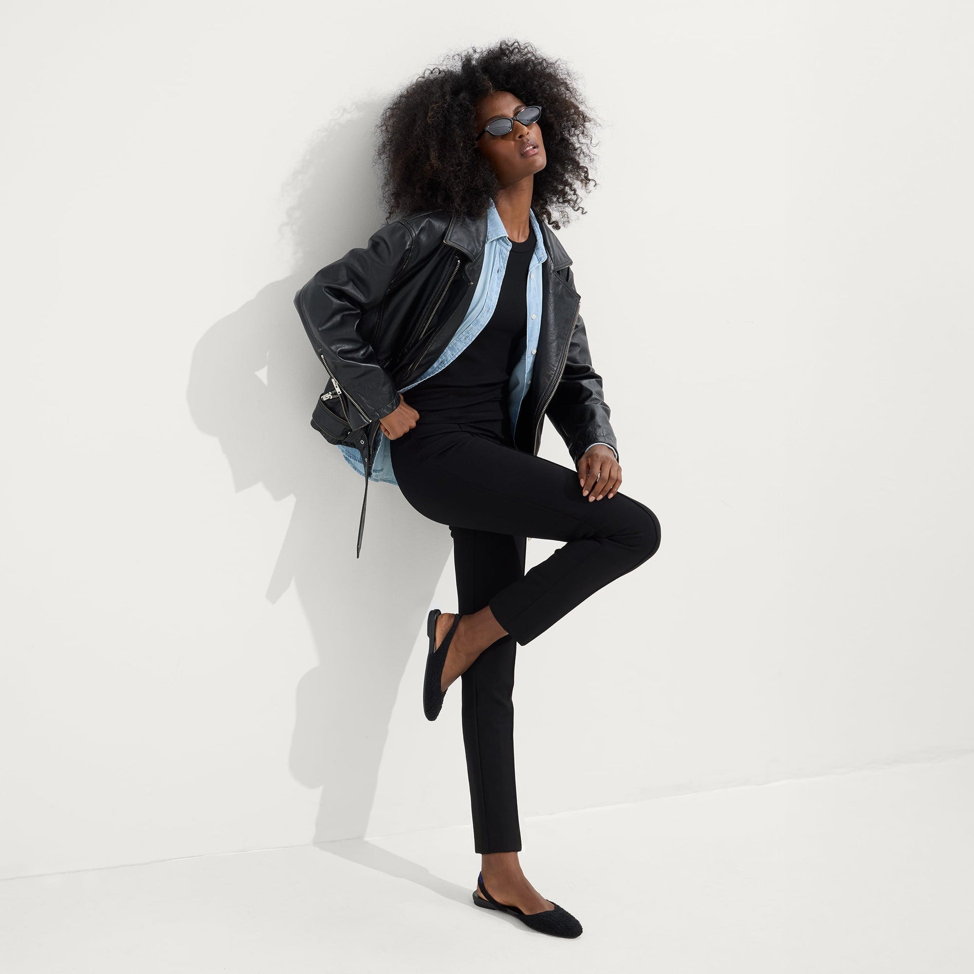 - Soft, flexible upper in a shimmery black bouclé with an almond-toe profile.