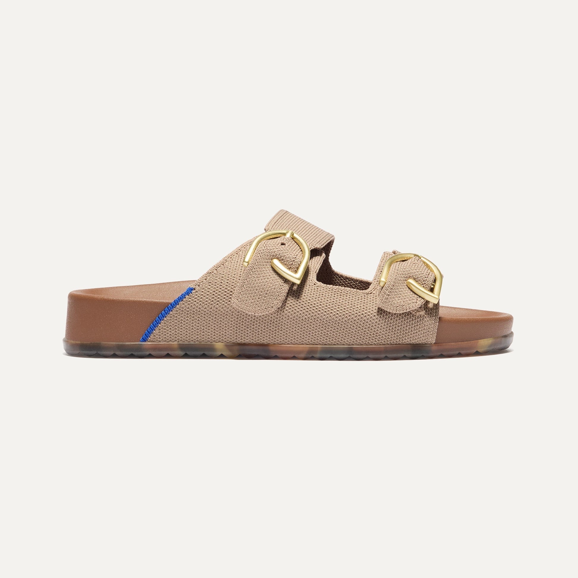 - Flexible, softly-knit upper with two wide straps in warm taupe.