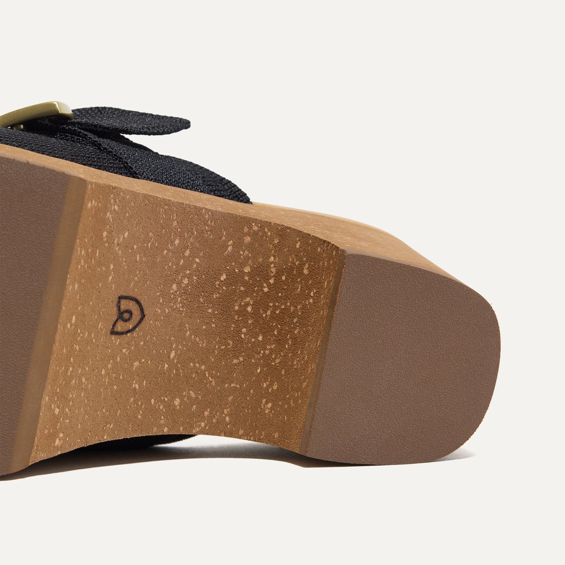 - Soft, roomy upper in black knit with Rothy’s signature thread.
