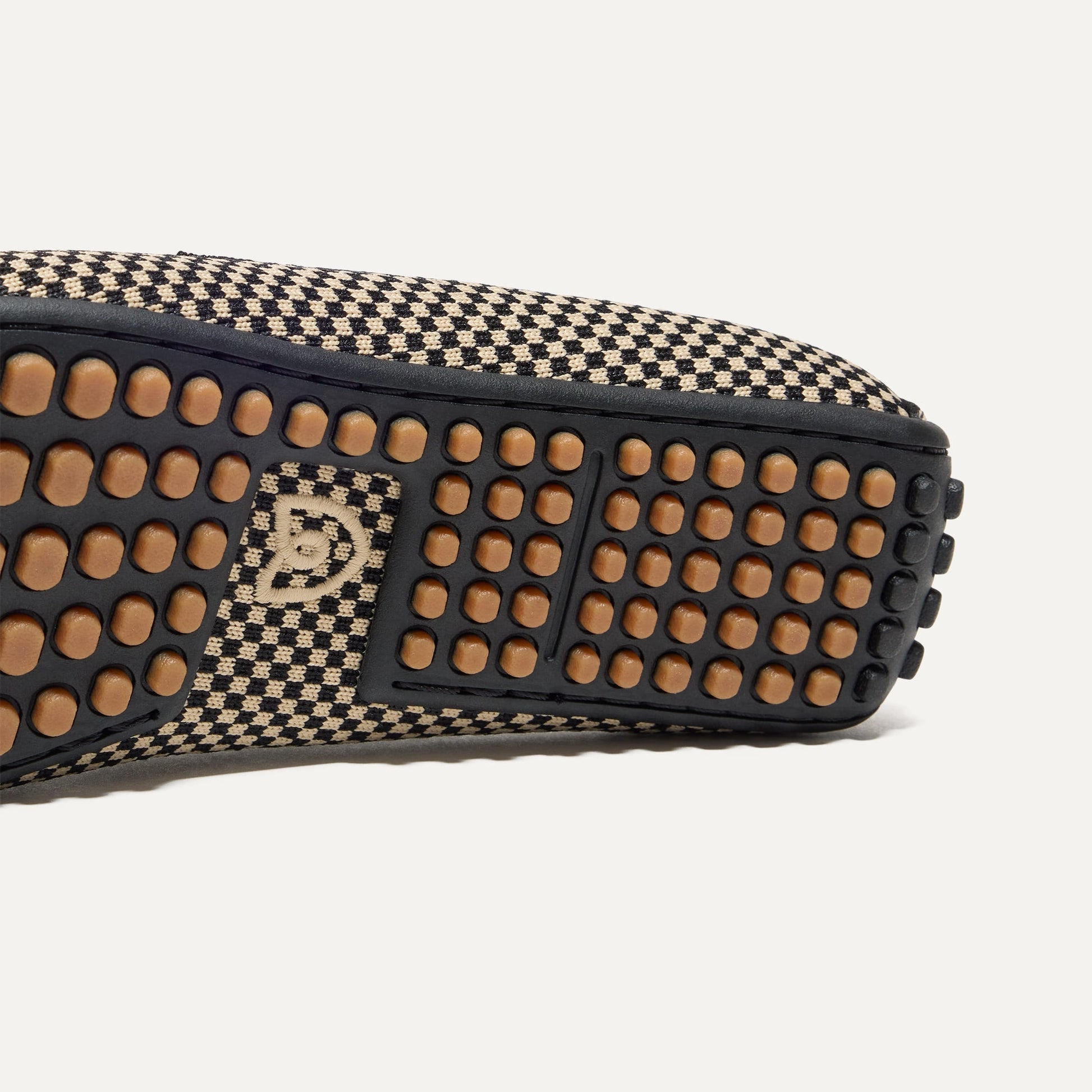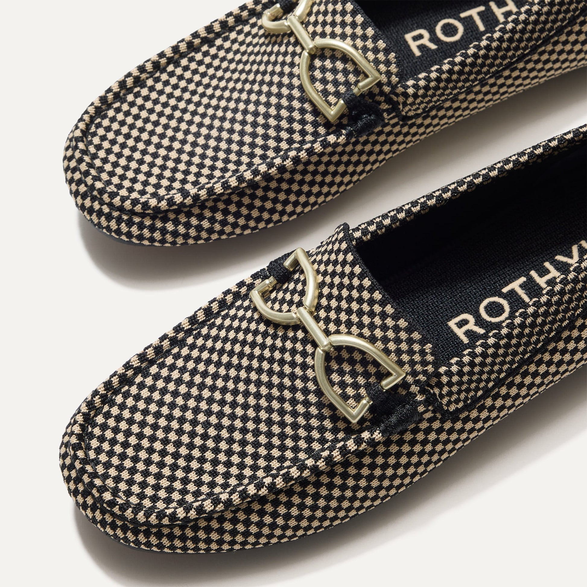 - Soft, flexible upper in an ivory and black micro checkered pattern with a gold hardware signet bit on the vamp.